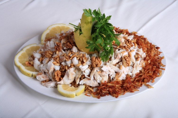 9. طريقة التقديم: يقدّم الأرز الأسمر والسمك ويزيّن بالبصل المقلي والصنوبر، وتقدّم إلى جانبه الصلصة السمراء.