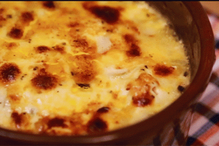 4. تُضاف الأجبان المبشورة ثم يوضع الطاجن في فرن ساخن على درجة حرارة 160 لمدة ساعة أو حتى يكتسب اللون الذهبي.
