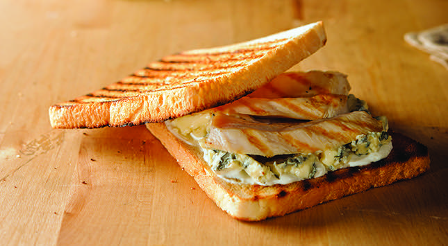 يخلط الجبن مع المايونيز، ثم تفرد 3 ملاعق كبيرة من خليط الجبن على كل من 4 شرائح من الخبز، ثم يضاف ¼ مقدار الدجاج المطهي لكل شريحة، وتضاف شرائح الخبز المتبقية على الوجه.