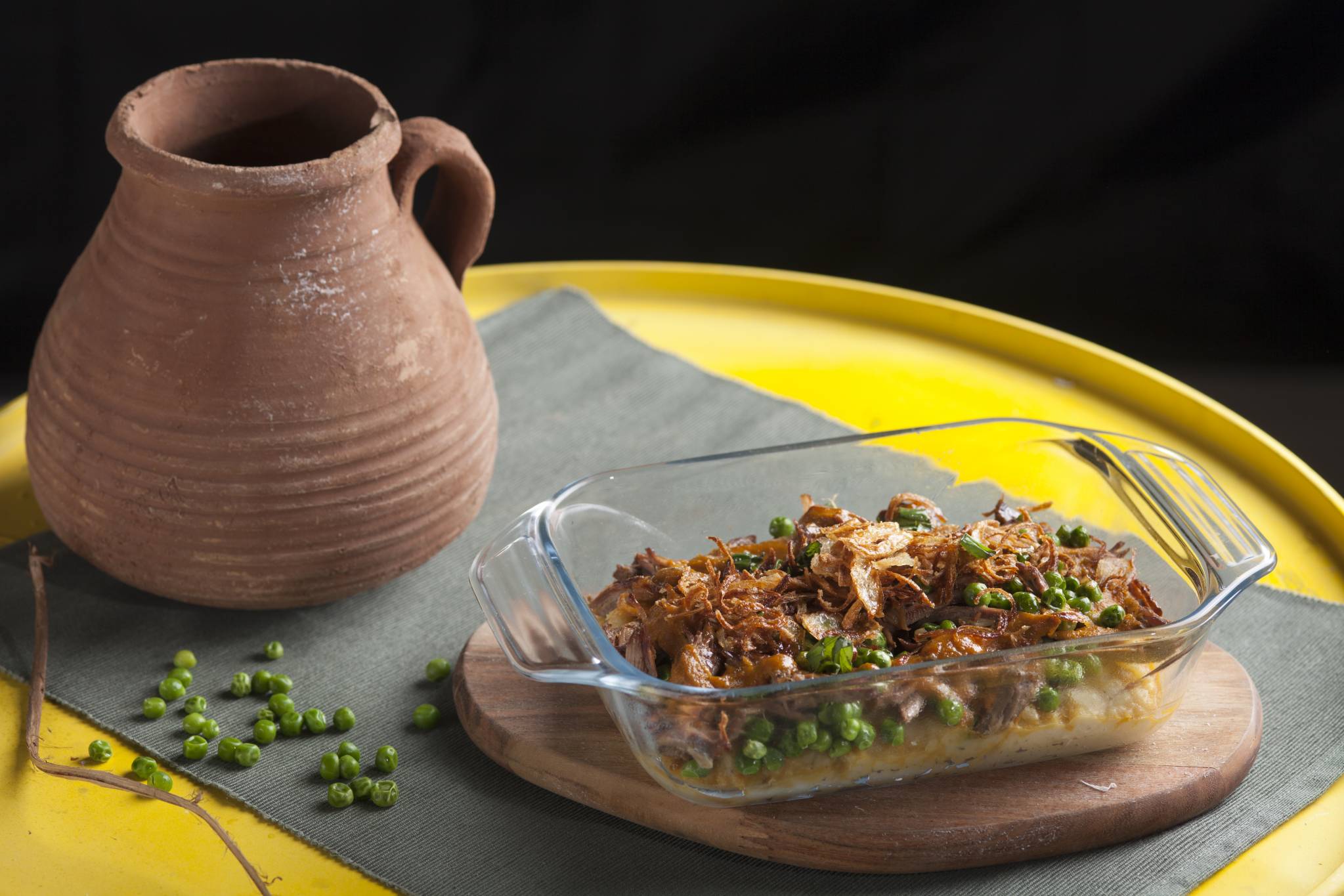 يتم رص البطاطا فى بايركس ثم يضاف عليها نساير اللحم ثم صوص اللحم بعد ضربه فى الخلاط