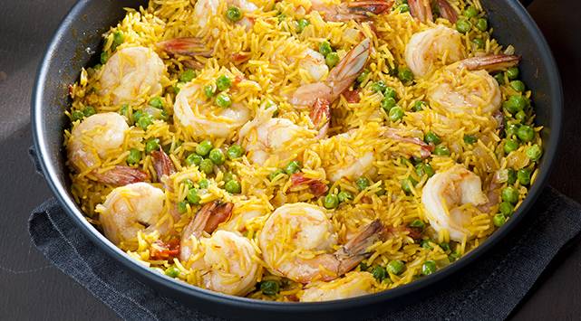 يُغطى الخليط ويُطهى لمدة 10 دقائق إلى أن يطرى الأرز ويمتص المرق بأكمله. تضاف البازلاء وتُقلب، تُطهى لمدة دقيقة واحدة. يضاف الروبيان الناضج ويُقلب. ثم يُقدم مباشرة.