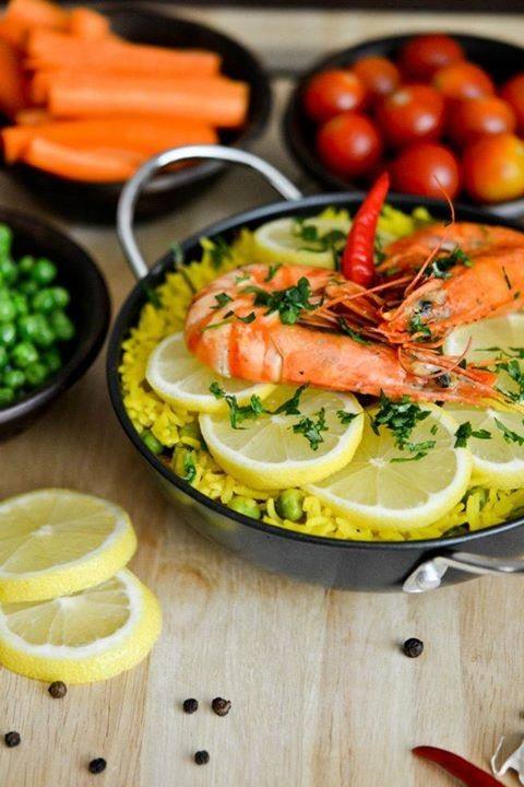 - في نفس الوقت نشوح الجمبري في زيت زيتون ونضيف البصل و الفلفل الوان و باقي التوابل .