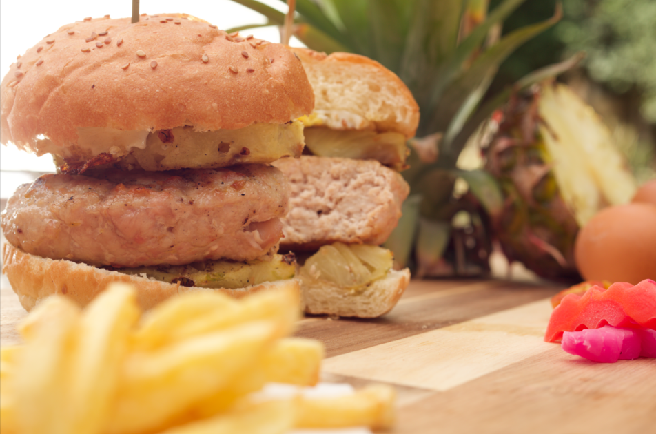 يقطع الخبز الي نصفين ونضع فوقه الاناناس ، البرجر والبيض ويقدم ساخناً