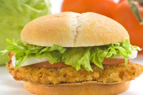 5. إقطعي خبز البرغر إلى قسمين، واحشيه بربع كمية الخس، ثمّ ضعي عليه قطعة الدجاج مع شريحتين من الطماطم والبصل.