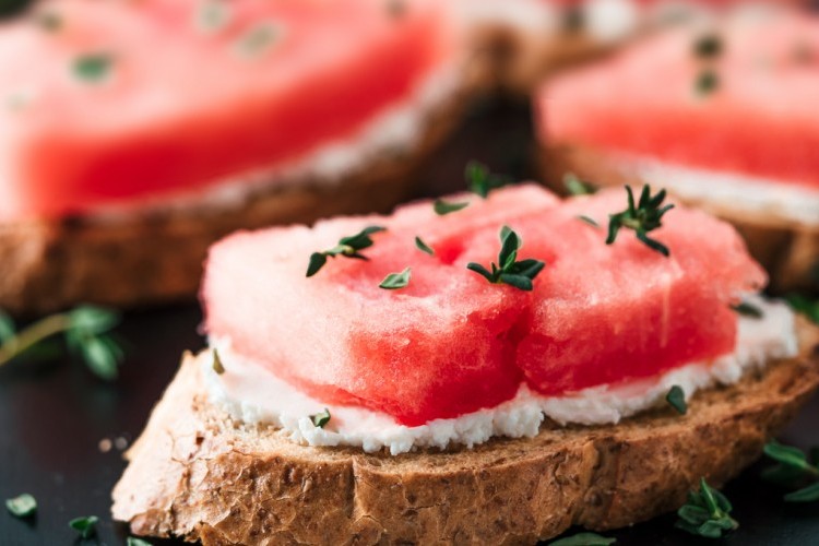 بروشكيتا الجبن الكريمي مع البطيخ لمقبلات شهية .. استغلي البطيخ الطازج واصنعي منه أطيب وصفات الأطباق الجانبية المنعشة واللذيذة جداً