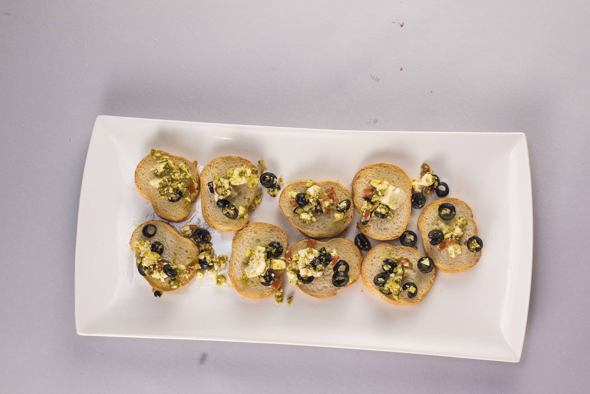 تجمع جبنة الفيتا والثوم والزيتون والريحان وترش فوق التوست. تخبز لمدة 10 دقائق أو حتى تسخن. تقدم دافئة.