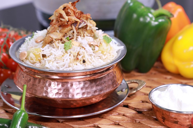 5. قدمي البرياني ساخن. وزيني بالبصل المقلي.