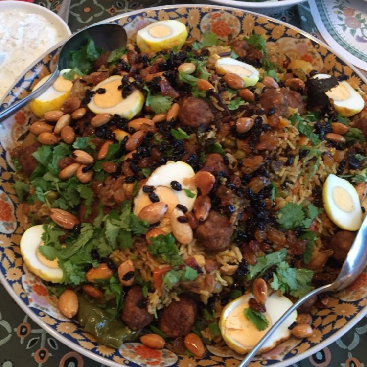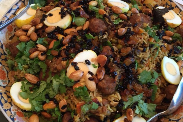 6. ثم نضيف الزعفران بماء الورد ويترك حتى ينضج قليلاً وبعدها يسكب ويزين بالكزبرة المفرومة والمكسرات والبيض المسلوق والمقلي بالزعفران.