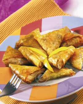 تقطع أوراق البسطيلة إلى أشرطة متساوية. يوضع القليل من الحشوة فوق طرف ورقة البسطيلة ويلف على شكل مثلت. يتبت طرف ورقة البسطيلة بقليل من أبيض البيض. تعاد نفس العملية حتى تنفد المقادير.