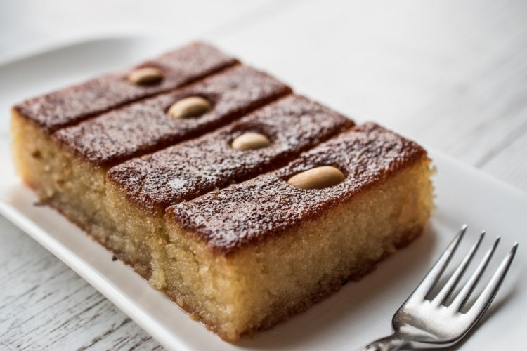 8. نسكب السيرم على البسبوسة وهي ساخنة ثم نتركها لتبرد تماماً للتقديم.