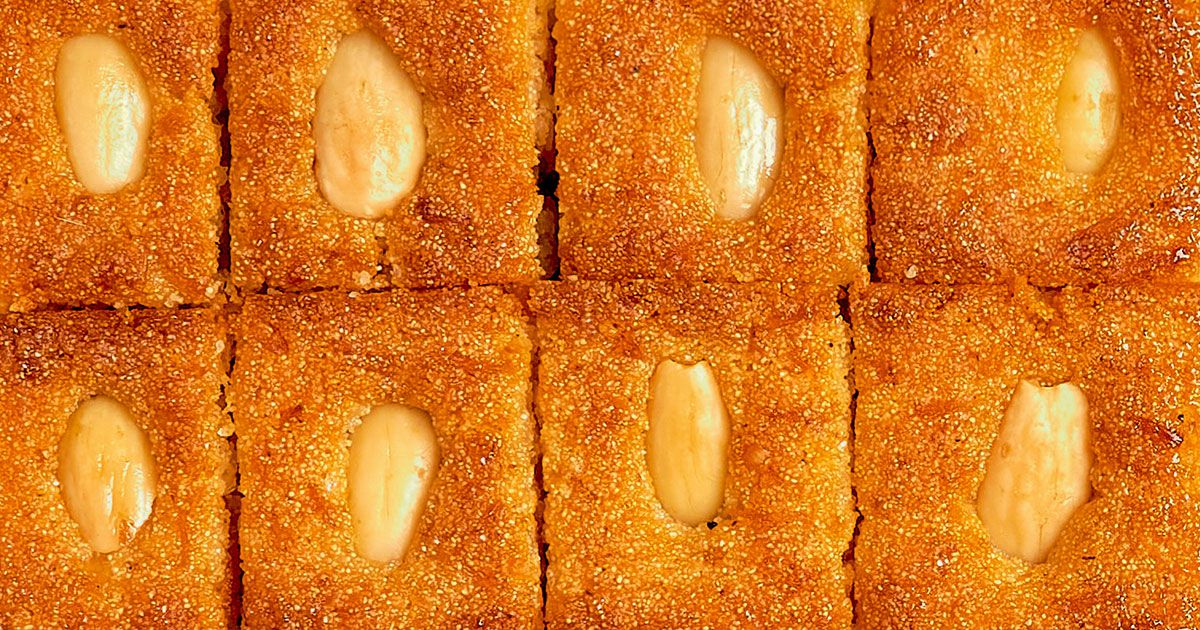 4- أدخلي الصينية إلى فرن محمى مسبقاً على حرارة 180 درجة مئوية حتى يتماسك خليط البسبوسة.
