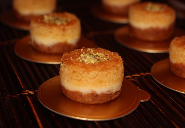 - تخرج البسبوسة من الفرن تسقى بالقطر البارد وتزين بالمكسرات .