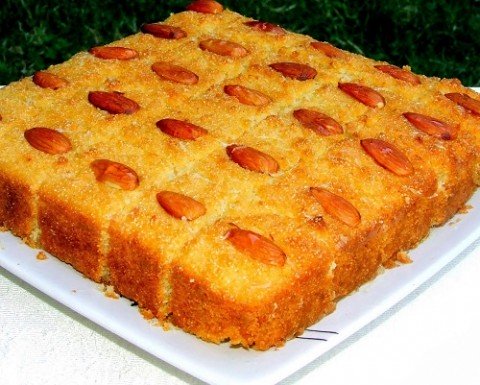 - ثم تدخل الفرن مرة اخرى مدة خمس دقايق ثم ترفع وهذه الخطوة اختياري وذلك لجعل البسبوسة مقرمشة قليلا.