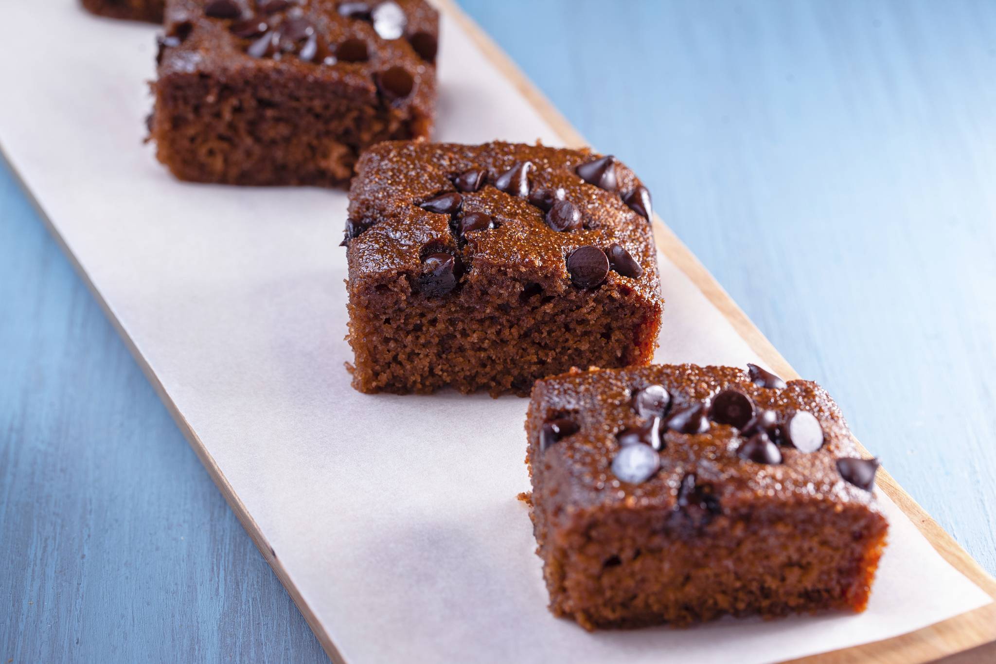 يسكب المزيج في الطبق ويسوى السطح، ثم يرش الوجه بقطع الشوكولاتة الصغيرة.