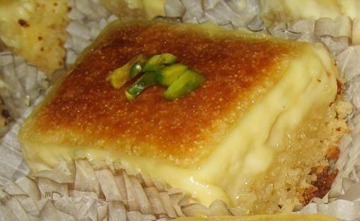 - ثم توضع على طبقة البسبوسة انتظري 3 دقائق حتى تتماسك طبقة الكاسترد