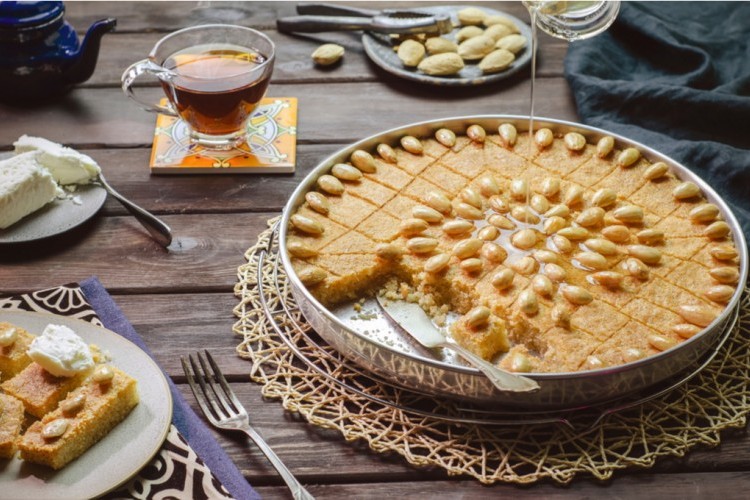 - اقطعي البسبوسة على شكل حبات الماس أو المربعات بسكين الزبدة.