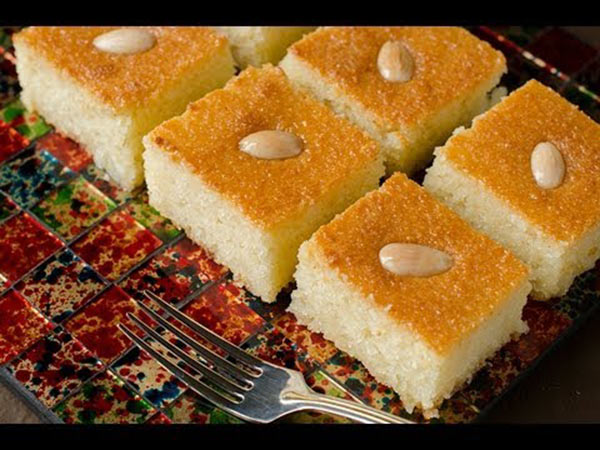 3. يُسكب مزيج السميد ويُسوّى بشكل متجانس في صينية الخبز المُعدّة. يُخبز في فرن محمّى على حرارة 190 درجة مئوية لمدة 35 دقيقة أو حتى يصبح لون الوجه ذهبياً.