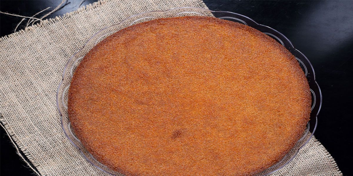 5- ادهني صينية فرن بالقليل من الزيت واسكبي نصف مزيج البسبوسة ثمّ ضعي قشدة القيمر فوقها وبعدها النصف المتبقّي من العجينة.