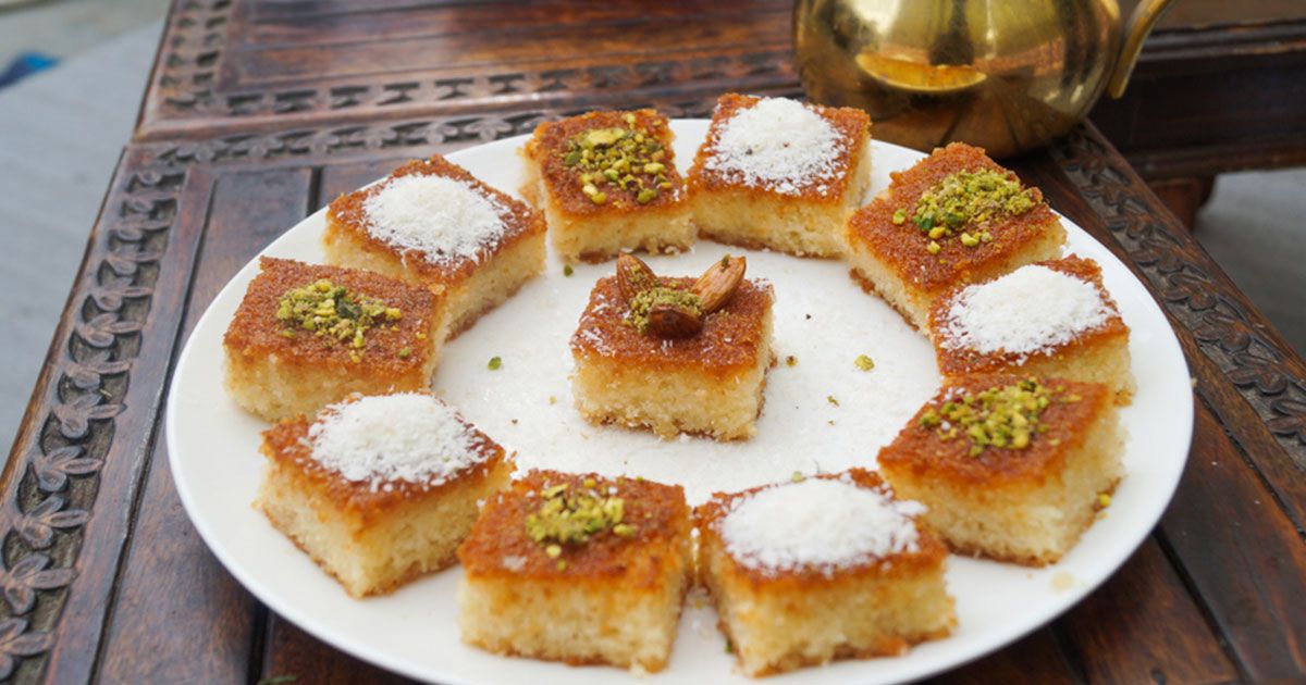 10- وزعي القطر على البسبوسة ثم زيني وجهها بجوز الهند المبشور أو الفستق الحلبي المجروش. 11-اتركي البسبوسة جانباُ حتى تبرد على حرارة الغرفة.