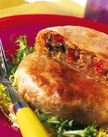 - تزين ورقة البسطيلة بحصة من الحشوة، تلف جوانب ورقتي البسطيلة حول الحشوة ثم تدهن بالزبدة والبيض.