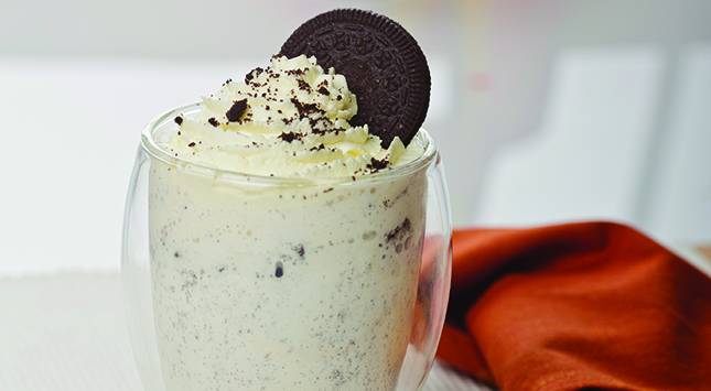 تُخلط الكوكيز مع الخليط، ثم يُصب الخليط في كؤوس التقديم.