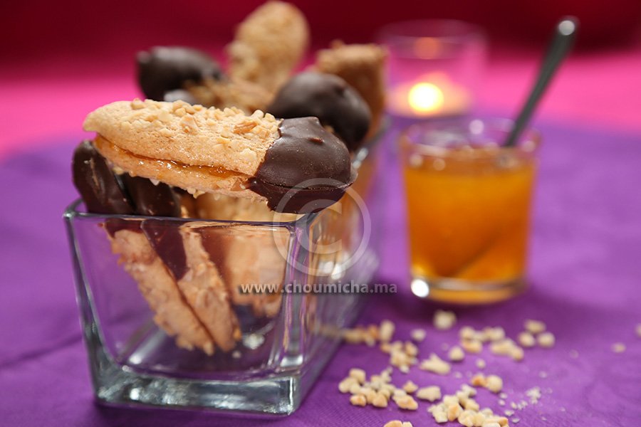 - تذاب الشكلاطة في حمام مريم. يغمر نصف البسكويت في الشكلاطة ثم يترك على جنب حتى تتصلب الشكلاطة. تجمع قطع البسكويت مثنى بمربى المشمش.