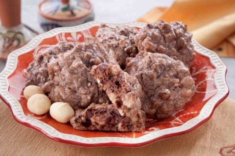 - أضيفي الدقيق، خليط الشوكولاتة، المكاديميا والشوكولاتة. باستعمال ملعقة خشبية قلبي الخليط إلى ان يختفي الدقيق.