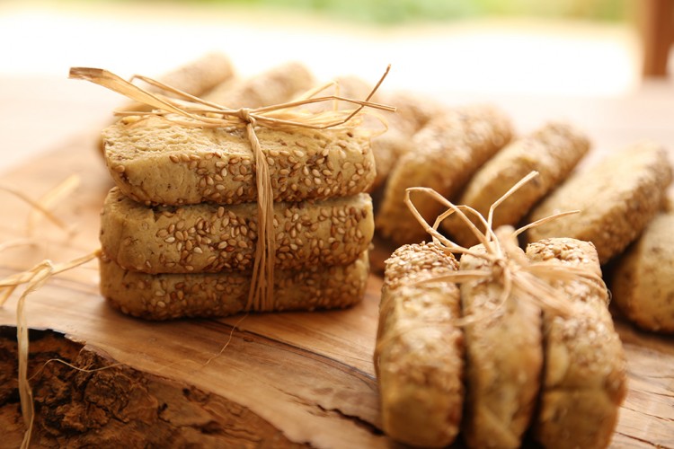 4. اقسمي جزء من العجينة ورشيها بالسمسم، وقطعيها بشكل مربعات أو بالشكل المفضل لديك.
