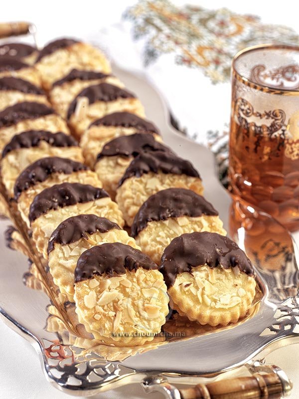 - يسخن الملمع (ناباج) مع الكليكوز، يغطس فيه سطح البسكويت ثم يمرر في رقائق اللوز.