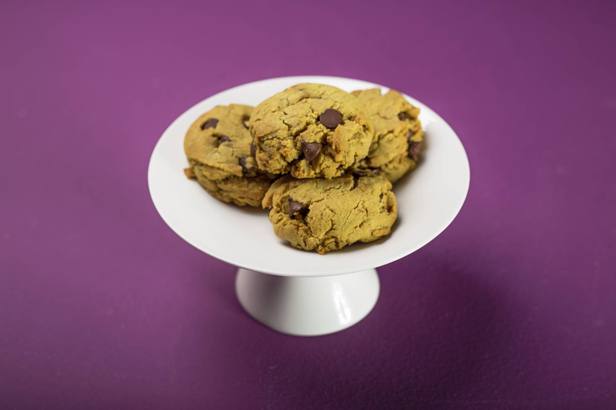 تضاف المقادير الجافة إلى المقادير السائلة وتخلط معاً حتى الحصول على عجينة البسكويت. تضاف رقائق الشوكولاتة وتخلط معاً.