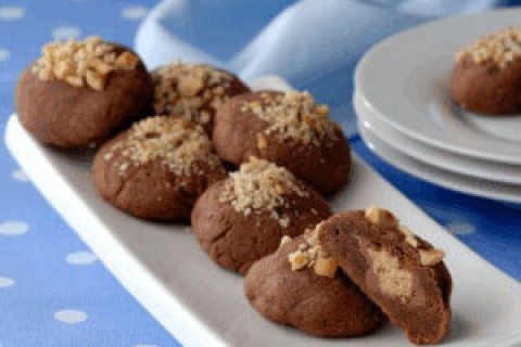 - يوضع بسكويت الكوكيز على صواني الخبز المغلّفة بورق الخبز مع ترك الجهة المغطّاة بالبندق مواجهة للأعلى. تُخبز في فرن محمّى على حرارة 180 درجة مئوية لمدّة 9-10 دقائق أو حتى تنضج. يُترك البسكويت على الصينية ليصبح شديداً ومن ثمّ يُنقل إلى شبك معدني للتبريد.
