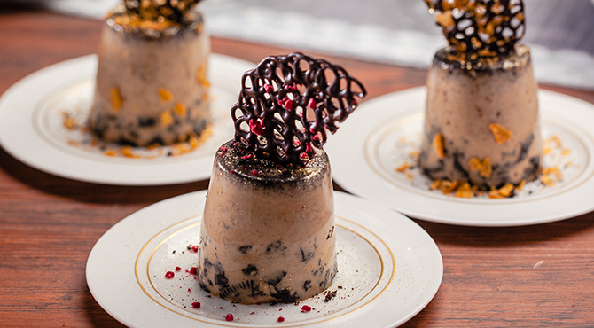 تقلب الكؤؤس في اطباق وتزين بالشوكولاته وحبوب القهوه