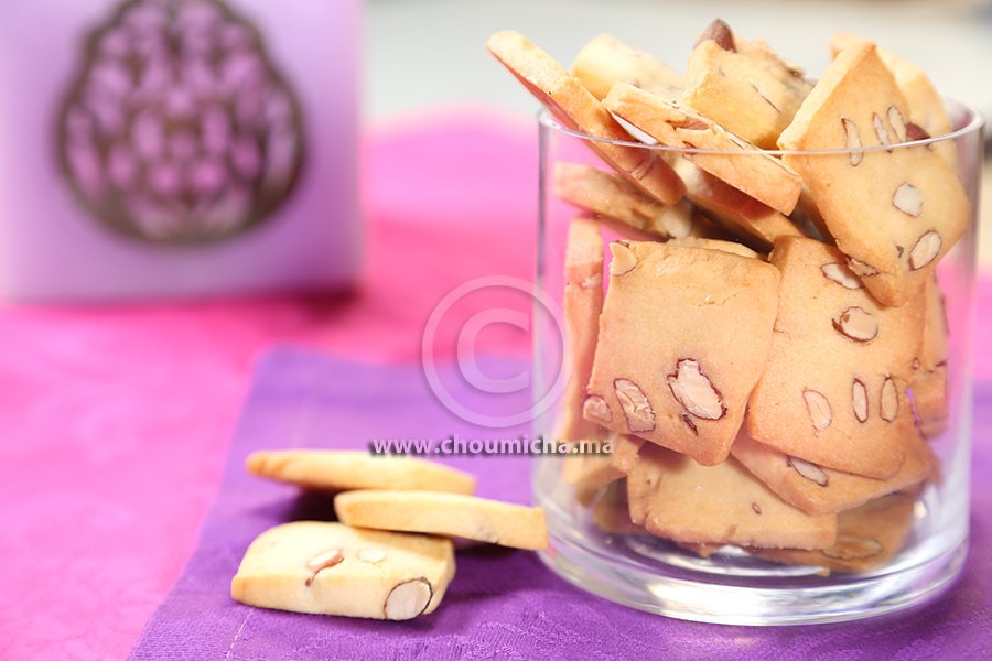 - تدلك الزبدة مع السكر الناعم. يضاف البيض، الزيت وخليط الدقيق. يخلط الكل للحصول على عجين منسجم ثم يضاف إليه اللوز. يدلك العجين لتثبيت اللوز.