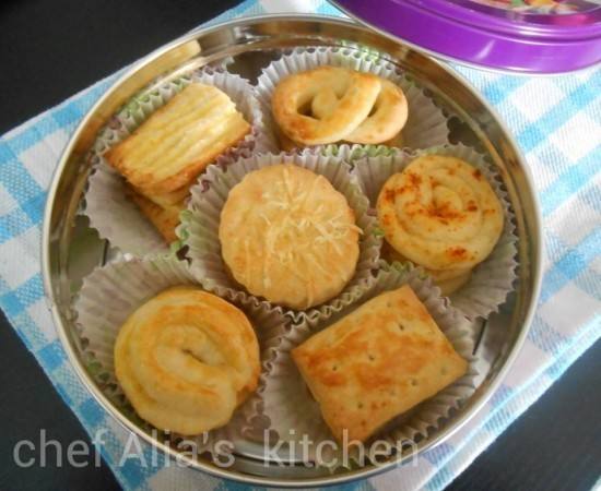 - يخلط الدقيق مع البيكينج باودرثم تضاف الزبدة الى ان يصبح الخليط رملى ثم تضاف الجبنة الشيدر ونخلط .