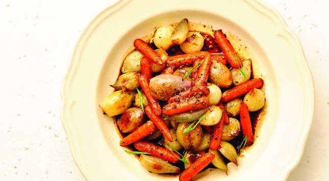 يُسخن الفرن إلى درجة حرارة 425 مئوية. يُقلب البصل والكراث والجزر الصغير والملح والفلفل وزيت الزيتون معًا، ويُنقل الخليط إلى قالب صينية خبز متوسطة الحجم.