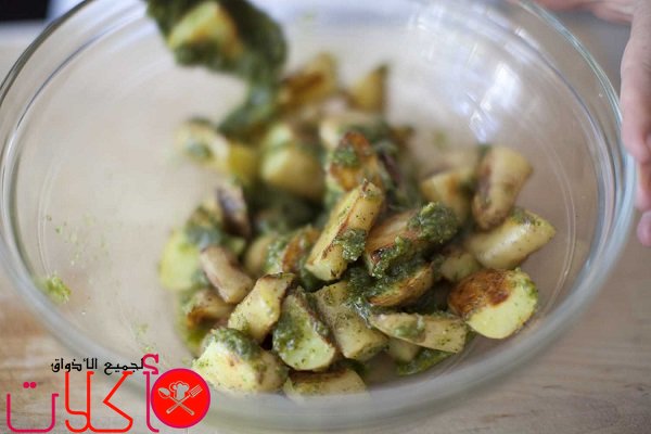 ٨-في وعاء كبيرة نضع حبات البطاطا وتتبل بالملح و نضع الزيت ثم ٣ ملاعق من صوص البيستو وتحرك بحيث تغطى كل القطع بالصوص.