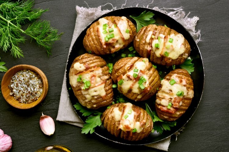 - اغسلي البطاطس جيداً ثم قطعيها إلى شرائح على شكل أكورديون، كما في الصورة.