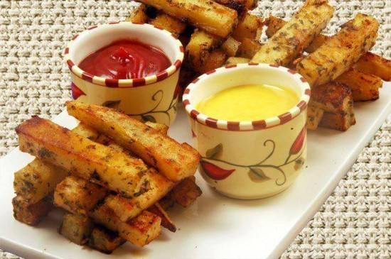 - تُقدم ساخنة مع صلصة الكاتشب وخليط من صلصة المايونيز ومعجون المستردة (الخردل) .