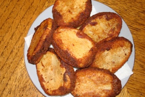4. سخني الزيت في مقلاة واسعة، اقلي الشرائح لتصبح ذهبية اللون. قدميها دافئة.