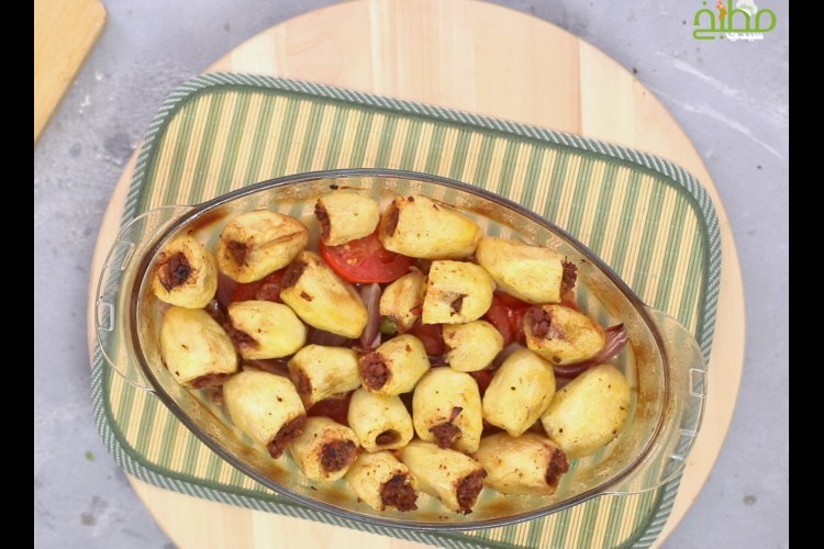 4. يتم وضع حشو اللحم في البطاطس، ترص في صينية مع شرائح البصل والطماطم.