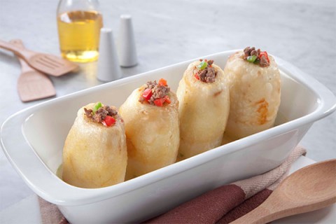 - وزعي الخليط في حبات البطاطس. أسكبي المرق. غلفي الطبق بقطعة من ورق الألمنيوم.
