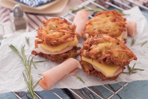 - نضع الجبن وقطعة اللحم على قطعة البطاطس ونغطى بقطعة أخرى .. وتقدم ساخنة