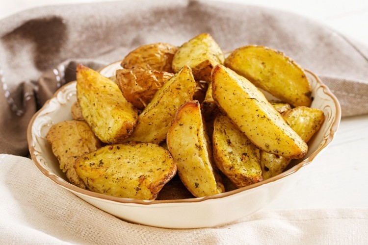 - ضعي الطبق في الفرن على حرارة 180 درجة لمدة 20 – 25 دقيقة حتى تتحمر وتتقرمش البطاطس وقدميها ساخنة.