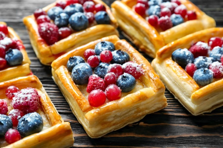 3. مدي قليلاً عجينة البف باستري ووزعي القشطة عليها ثم وزعي التوت المشكل.
