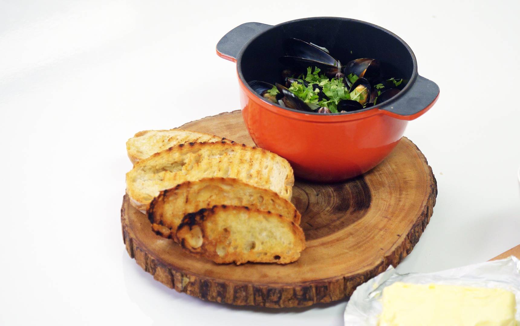 يضاف بلح البحر المغسول و المنظف و يقلب لمدة 3-2 دقائق مع البصل و الثوم قبل اضافة الماء و الكريمة و الملح و الفلفل