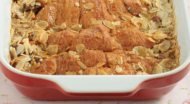 ثم تضاف كمية وافرة من التمر على الوجه، ثم تُغطى بطبقة أخرى من الكرواسون. أخيرًا، تُصب كمية وافرة من خليط الحليب والبيض على وجه البودنج.