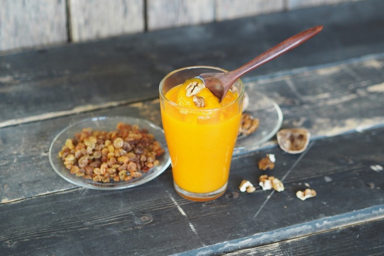 3. عندما تبرد البطاطا قشريها واضربيها في الخلاط حتى تصبح ناعمة، وأضيفي الحليب على دفعات كل مرة نصف كوب، ومعهم العسل والفانيليا، والملح وجوزة الطيب حتى يصبح الخليط ناعم جداً ويأخذ قوام البودينج.