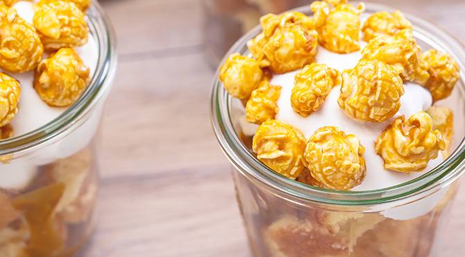 يجمع الكراميل والملح في وعاء. ويسكب خليط الكراميل بالملعقة على الكيك الإسفنجي في المرطبانات أو الكوؤس. ثم توضع شرائح الموز عليه، ثم الكريمة، ثم الفشار. ثم يقدم.