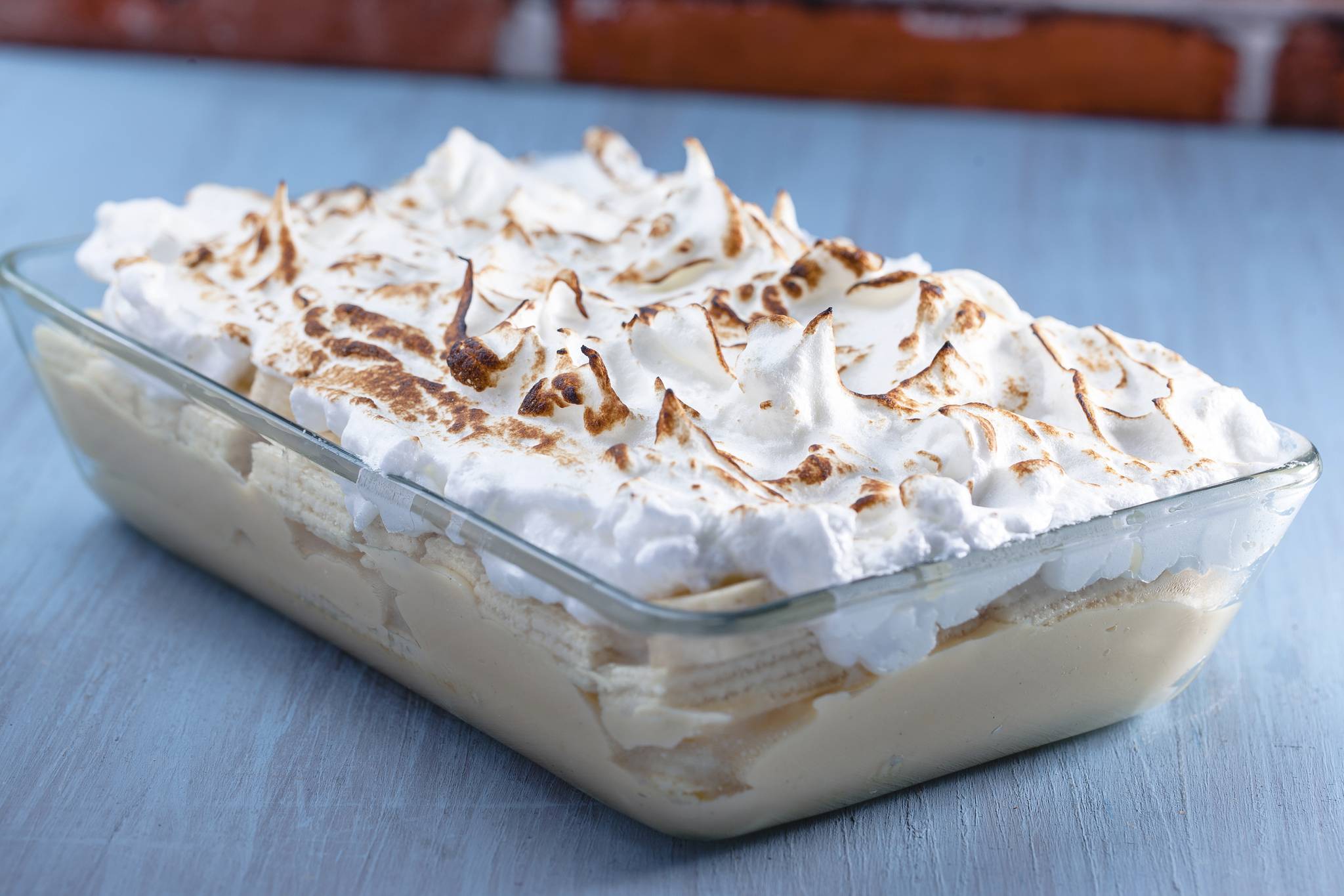 توزع طبقة رقيقة من البودينج في طبق كاسرول بسعة ¾ لتر. توزع طبقة من ويفر الفانيليا فوق البودينج. يقطع الموز إلى شرائح رفيعة مائلة بسماكة 1/8 بوصة تقريباً، وتوزع طبقة من شرائح الموز فوق الويفر. يوزع ثلث كمية البودينج المتبقية فوق الموز. تكرر عملية توزيع طبقات الويفر والموز والبودينج بحيث تكون الطبقة الأخيرة من البودينج.