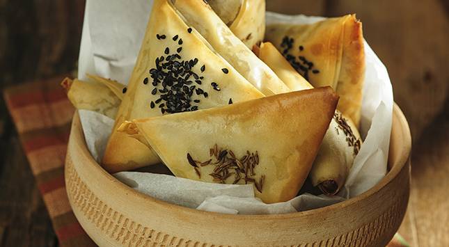 تُرش حبوب الكمون وحبة البركة على وجه لفائف البوريك.